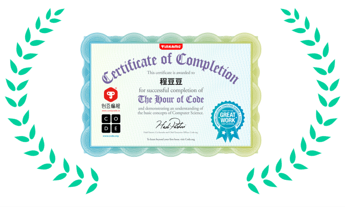 編程一小時(The Hour of Code)是一個全球性的公益活動,并獲得了比爾蓋茨、扎克伯格等科技精英的大力支持,連美國前總統(tǒng)奧巴馬都學習過。孩子們在創(chuàng)豆編程完成階段學習后將獲得國際認證的《編程一小時證書》。